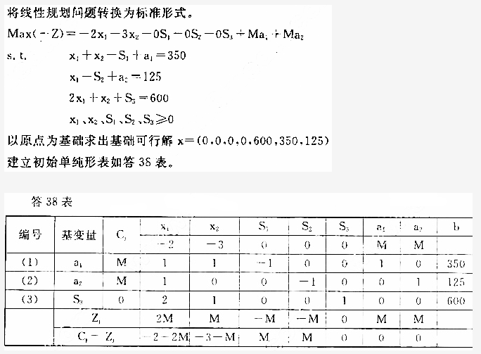 2、将题37中线性规划问题转换为标准形式,以原点为基础求出基础可行解,并建立初始单纯形表