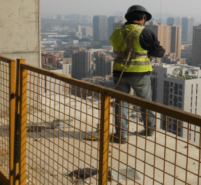 27、如图,一名作业人员在进行临边作业,周边存在部分钢制构件未清理,请问图示中存在哪些危险因素。()