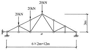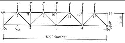 17、图17所示简支铰接钢桁架,其计算跨度l0=20m,桁架高度h=2.5m,该桁架节点7~13均作用集中力P=100kN,则桁架下弦杆1-2的轴力N1-2为多少?()