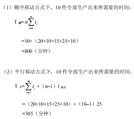 (3)平行移动加工方式优点:充分利用平行作业的可能,使生产周期达到最短;缺点:一些工序在加工时,出现时干时停的现象,对设备运转不利,同时运输次数多,组织生产比较麻烦。