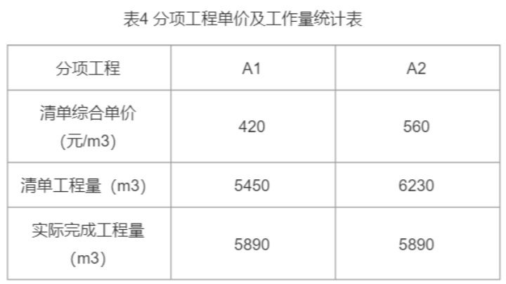 1、建设单位投资酒店工程,建筑面积为2.20万平方米,钢筋混凝土框架结构,建设单位编制了招标文件,发布了招标公告,招标控制价为1.056亿元。 项目实行施工总承包,承包范围为土建、水电、通风空调、消防、装饰装修及园林景观工程,消防及园林景观由建设单位单独发包,主要设备由建设单位采购。先后有13家单位通过了资格预审后参加投标,最终D施工单位以9900.00万元中标。双方按照《建设工程施工合同(示范文本)》(GF-2017-0201)签订了施工总承包合同,部分条款约定为:工程质量合格;实际工程量差异在±5%(含±5%)以内时按照工程量清单综合单价结算,超出幅度大于5%时按照工程量清单综合单价的0.9倍结算,减少幅度大于5%时按照工程量清单综合单价的1.1倍结算。D施工单位中标后正常开展了相关工作:组建了项目经理部;搭建临时设施;制定招采计划,自行将玻璃幕墙分包给符合资质要求、施工能力较强的一家装饰公司负责施工,并签订了专业分包合同;进行项目成本分析、成本目标的制定,通过分析中标价得知,期间费用为642.00万元,利润为891.00万元。增值税为990.00万元。有两项分项工程完成后,双方及时确认了实际完成工作量。如表4: