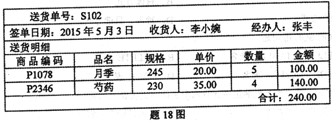 18、创建一个“鲜花快递信息一览”报表,列出所有快递单及其送货明细信息,其中每一张快递单的输出格式如图所示。该报表快递单的送货明细记录应置于()