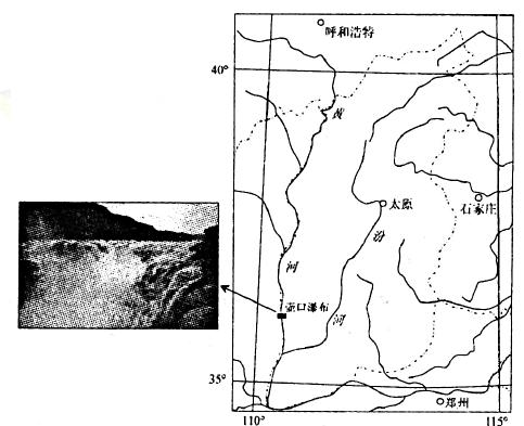 16、每年三月下旬到四月上旬壶口瀑布水量骤增,每秒流量达到2440立方米,形成壮美瀑 布群。由于恰逢沿岸山桃花盛开,故被称为“桃花汛”。下图是区域水系分布图和壶口瀑 布景观图,据此完成下面小题。