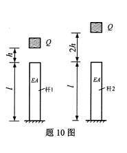 10、图示为材料和尺寸相同的两个杆件,它们受到高度分别为h和2办的重量Q的自由落体的冲击,杆1的动荷系数Kd1和杆2的动荷系数Kd2应为()