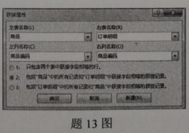 13、设置商品和订单明细2个表的联接操作方式如题13图所示,则商品和订单明细2个表的联接属于()