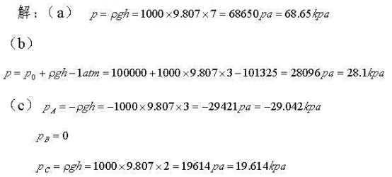 试求图(a)(b)(c)中A、B、C点的相对压强。P0是绝对压强,大气压强Pa=1atm。液体为水。